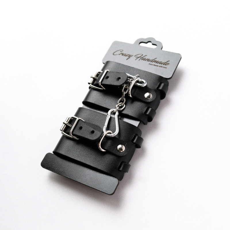 На каждом наручнике прочное хромированное овальное кольцо. В комплекте соединительная цепочка с двумя карабинами.